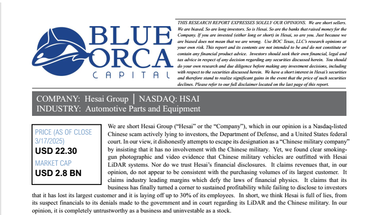 无风不起浪。3月18日,号称“杀人鲸”的知名做空机构蓝鲸资本(Blue Orca Capital),发布针对中概股禾赛(HSAI)的做空报告。报告认为,禾赛宣称的收入,似乎与其最大客户的采购量不符。