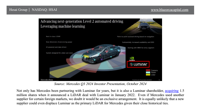 此外,蓝鲸认为,即使奔驰同意以某种有限的方式与禾赛(或禾赛的合资伙伴)合作,几乎肯定不会是一个独家合同。因为,奔驰已经与另一家激光雷达生产商Luminar(LAZR)建立了合作关系。