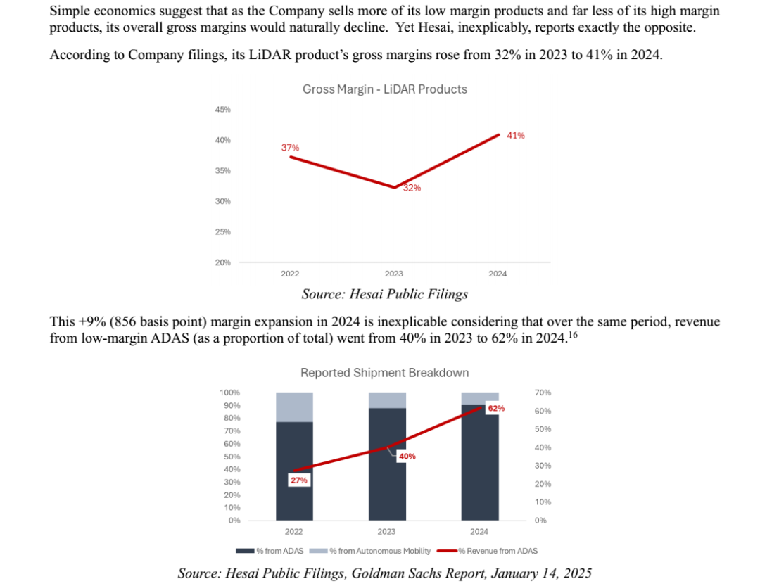 蓝鲸认为,考虑到在同一时期,禾赛来自低利润ADAS产品的收入占比从2023年的40%上升到2024年的62%,2024年毛利率扩张+9%(856基点)是无法解释的。蓝鲸认为这完全是胡说八道。