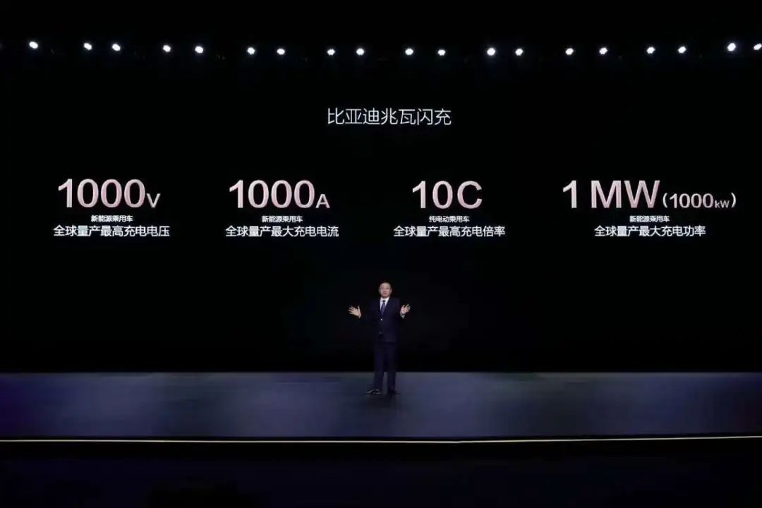 而本周,一场名为“兆瓦闪充,油电同速”的发布会徐徐拉开了帷幕,比亚迪掌舵者王传福宣布,搭载超级e平台的比亚迪车型,将支持1000V电压、1000A电流,实现1兆瓦(1000kW)充电功率,以及10C的充电倍率。