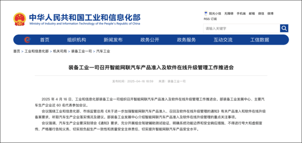 当然,在前两天,只因工信部于4月16日组织召开智能网联汽车产品准入及软件在线升级管理工作推进会,就《关于进一步加强智能网联汽车产品准入、召回及软件在线升级管理的通知》(以下简称《通知》)有关产品准入和软件在线升级备案要求,听取汽车生产企业落实情况及建议。