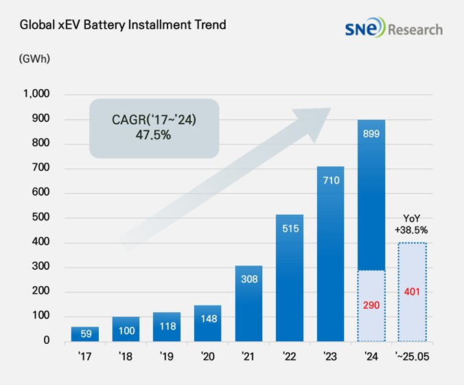 先来看最新的数据。根据韩国研究机构SNE Research的最新披露,2025年1~5月全球动力电池装车总量为401.3GWh,同比增长38.5%。(见上图)