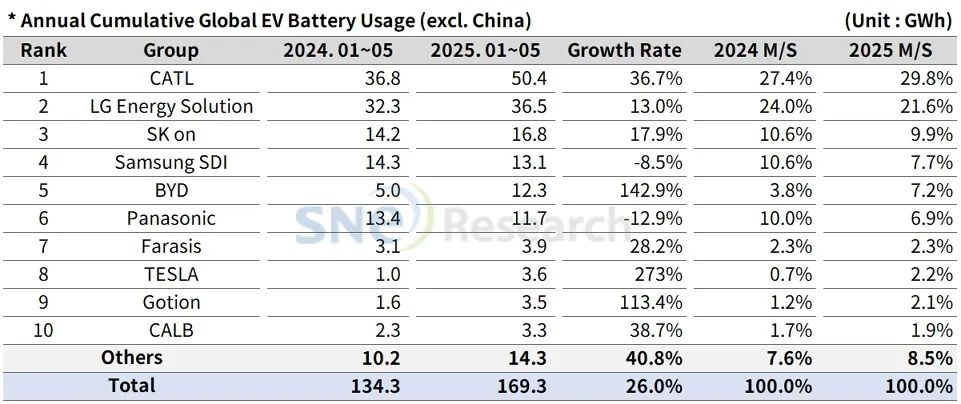 而从排名来看,与2024年同期相比,TOP10公司中,TOP3公司宁德时代、比亚迪、LGES排名不变,中创新航由第6名升至第4名。