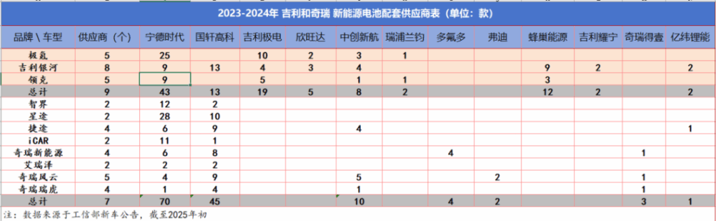 还有一个不能绕开的问题,就是车企除了自研,电池的二供甚至三四五六七八供都有,也就是不把鸡蛋放在一个篮子里。从我们整理的2023~2024年的吉利和奇瑞的电池供应商表格中,您能看出些东西来吗?嘿嘿。