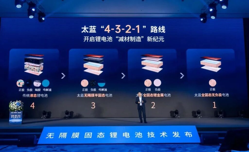 按照太蓝的“4321”路线和“减材制造”理念,现有的液态电池是四大主材,正极、负极、隔膜、电解液,到太蓝半固态电池取消有机隔膜和部分电解液,到第二代全固态电池,隔膜和电解液都被取消,最终达到的全固态电池形态是“无隔膜无负极全固态电池”,即负极材料也取消,只保留正极材料。