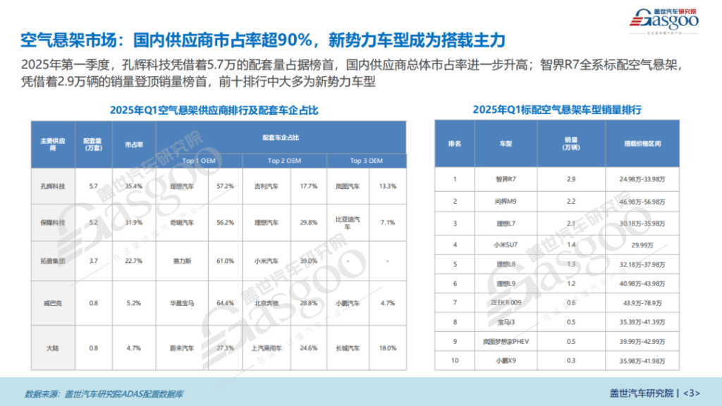 在“软硬解耦”模式下,国内厂商如保隆科技专攻空气弹簧,中鼎股份通过收购AMK掌握空气供给单元技术,2023年,国产空气悬架市场份额就已上升到70%,远超外资品牌。根据盖世汽车研究院的数据,2025Q1国产市占率超过90%。另外,市场份额第一的孔辉科技,更是很早就掌握了主动权。