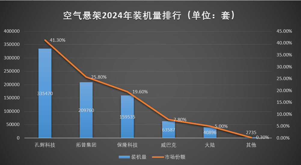 这三家是,孔辉科技以335470套的装机量位居TOP1,占据41.3%的市场份额。拓普集团的209760套、25.8%的市场份额,保隆科技的159535套、19.6%的市场份额,位居第二和第三。这也充分展示了自主厂商在空气悬架领域不断成长的竞争力。