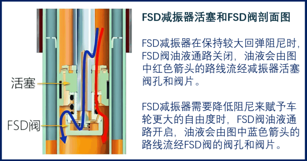FSD(Frequency Selective Damping)翻译过来叫自适应调整减振器,是在常规减振器固定式阀门的基础上,多一个FSD阀和油路通道。当汽车正常行驶时,由于悬架是低频振动,FSD阀会关闭,相当于是个常规减振器。