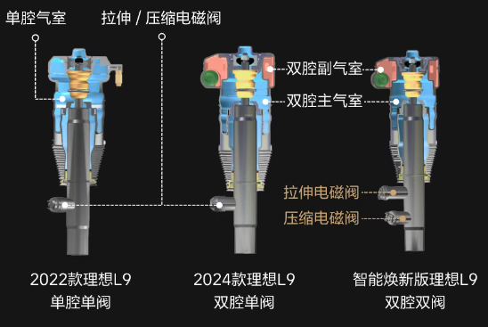 而从数据也能看出区别,比如,焕新版理想L9(双腔双阀)相比2024款L9(双腔单阀)转弯侧倾降低25%。而如果和2022款L9(单腔单阀)相比,则降低45%之多。