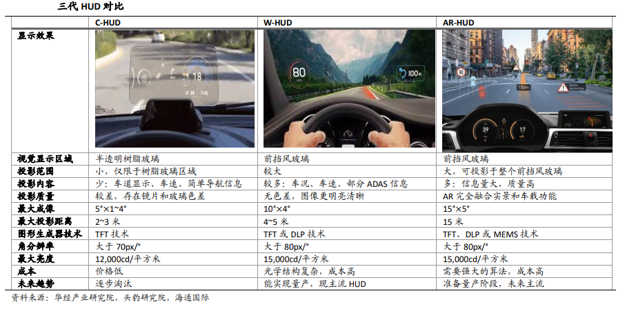 而AR-HUD(增强现实HUD),则是下一代的HUD解决方案。在W-HUD的基础上,AR-HUD结合了TFT、DLP和LCoS等光学投影成像技术,支持更远的投影距离和更大的视场角。