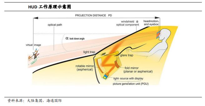 车载HUD解决方案可以分为C-HUD、W-HUD和AR-HUD三类。目前主流的解决方案是W-HUD,影像直接投射到前挡风玻璃上,出现在驾驶员视野前方。