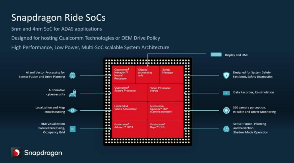 SA8650还可以对应12个摄像头,即8个800万像素,4个400万像素。SA8650功耗大概25~40瓦,所以采用水冷设计。此外,高通从第四代起就不单独提供芯片,都以模组形式销售,模组包含一颗SoC,4颗电源管理,2~4颗LPDDR DRAM。