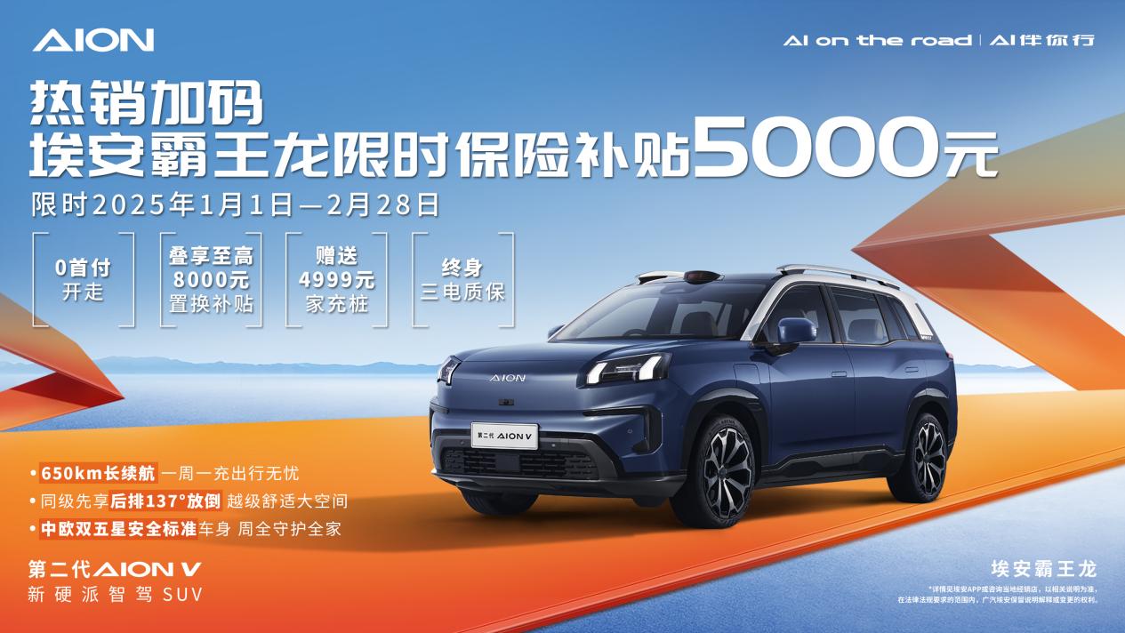 2025年第一天,埃安率先打响新年抢攻第一枪,不仅是回馈消费者,更是其作为中国新能源头部品牌的底气和实力。除了限时5000元保险补贴外,购买埃安霸王龙还可享0首付/3年8万0息金融政策、8000元置换补贴、赠送4999元家充桩以及终身三电质保。相信在越级实力和多重福利的刺激下,未来还会有更多的消费者成为埃安霸王龙车主,共同开启高品质出行生活。