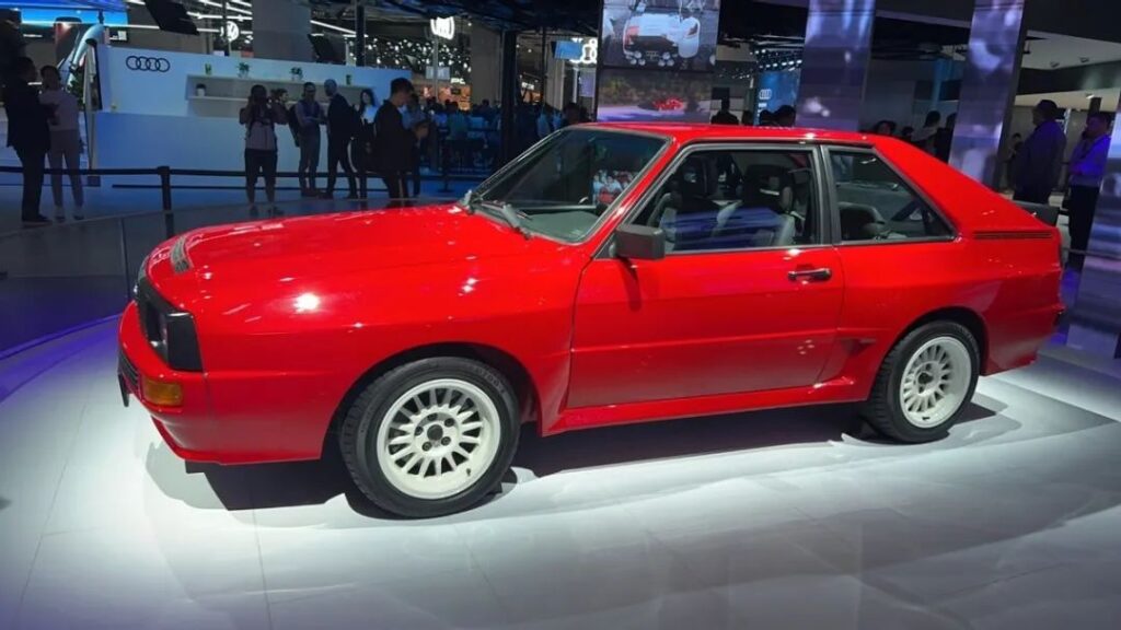 这是我在本届上海车展首日,于奥迪展台见到的一幕。讲话的是一位女士,当时她正挽着自己的男友,两人一同用仿佛拉丝般的眼神,凝望那台红色的奥迪quattro。