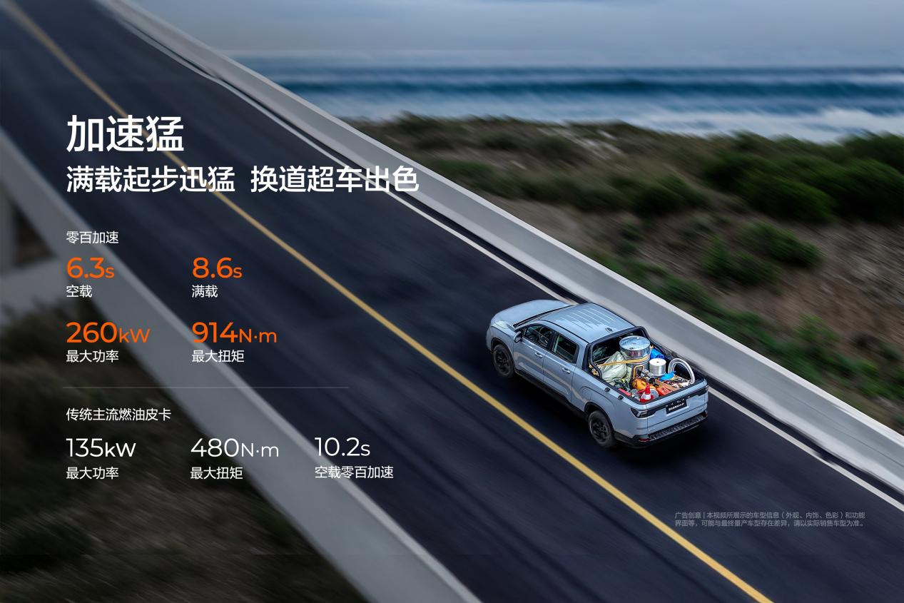 操控也完全对标中级新能源SUV,尤其是转向操控,最小转弯半径仅为 6.1m,比燃油皮卡小 0.4m,转弯轻巧灵活,配合电动助力转向系统,转向丝滑轻盈。