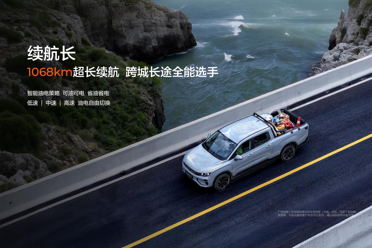 此次推出的两款新车,是国内首款上市的15万元级超级电混皮卡,最大综合扭矩近1000N.m, 最大耐久承载能力高达1.3吨,综合续航里程1068公里,百公里加速6秒级,百公里综合油耗仅为1.5L、亏电油耗约6L,最小转弯半径约6米。