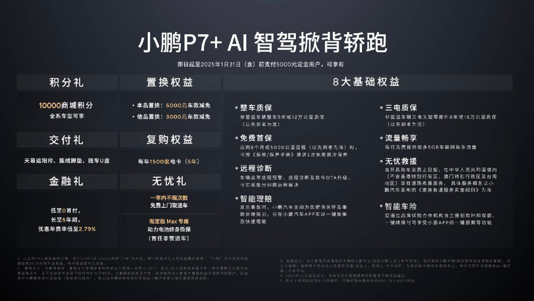 至2025年1月31日24点前支付5000元定金用户,除8大基础权益外,全系车型还可享10000小鹏商城积分、至高5000元的置换补贴、赠送每年1500度充电卡(6年)的复购权益、低至0首付长至5年期的限时优惠金融方案,以及免费赠送天幕遮阳帘、簇绒脚垫、随车U盘的交付礼等购车福利。用户可通过小鹏汽车官方APP、官网、微信小程序以及全国销售网点进行车辆订购。