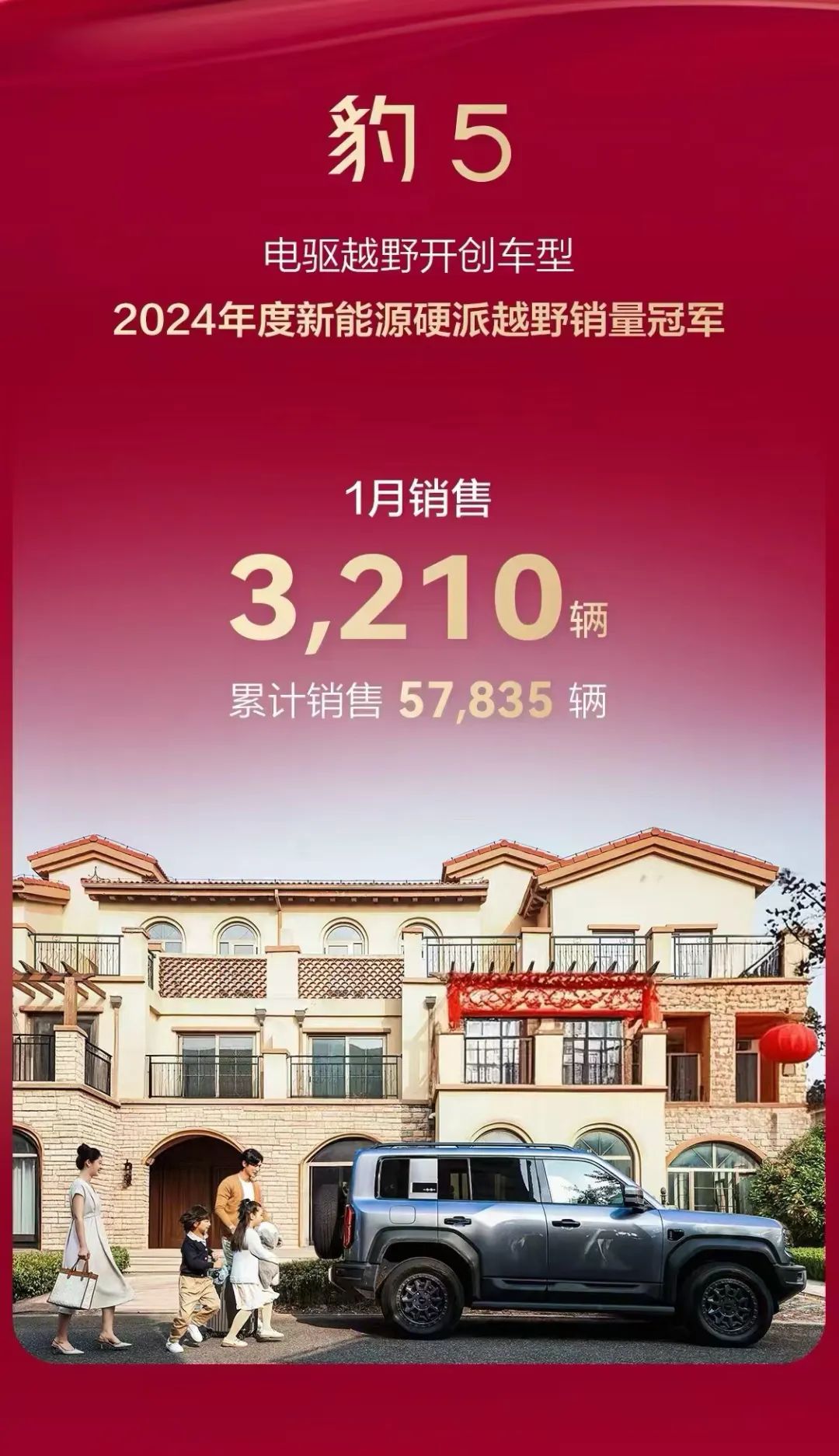 2024年,豹5的累计销售达到48,913辆,连续5个月蝉联新能源硬派越野销量冠军,顺带拿下了年度新能源硬派越野单车型销量冠军。截至今年1月,累计销售更是达57,835辆。
