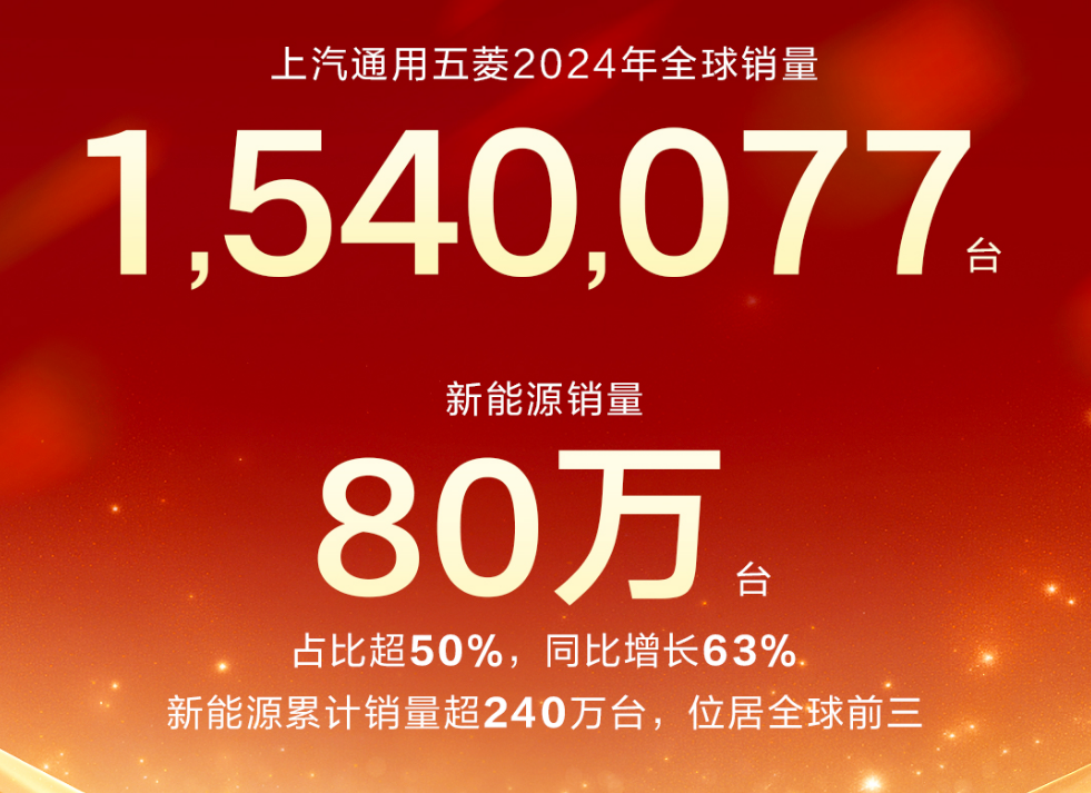 数据显示,2024年,上汽通用五菱拿出了全年总销量1,540,077台的出色成绩,其中,新能源销量达80万台,全年新能源销量占比首破50%,同比增长63%,超额完成全年目标;截至2024年底,上汽通用五菱新能源车累销突破240万辆,稳居全球前三,致力于成为全球新能源汽车普及者。其中,宏光MINIEV家族2024年劲销24万台,同比增长9.8%,连续52个月成为细分市场第一,累销突破145万辆,成为中国品牌纯电销冠。