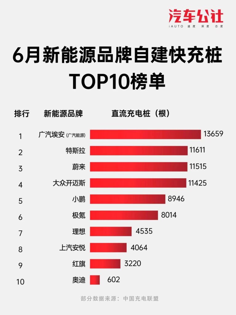 中国充电联盟2025年上半年统计数据出炉,在补能榜单上,广汽埃安持续领跑。继5月份以13159根直流快充桩夺得新能源汽车品牌数量第一后,6月份又以新增500根充电桩的成绩再次蝉联榜首,稳坐直流桩数量最多的车企品牌宝座。保持稳定增长的还有小鹏汽车、极氪,分别新增388、270根快充桩;值得一提的是,理想是增长最快的品牌,单月建桩数达3246根跃居第7,而红旗也以1434根的数量跻身前10。