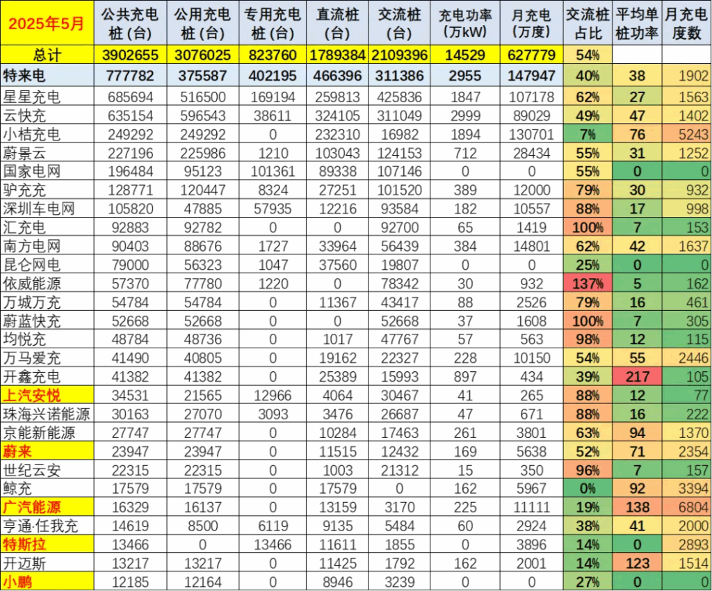 当然数量多、密度大还不够,还得考虑布局合理性,这体现在运营效率上。中国充电联盟5月数据显示,不同品牌充电桩运营效率呈现惊人分化:广汽埃安单桩月均充电量高达6804度,高居所有品牌之首;特斯拉以2893度位居次席,蔚来2354度紧随其后。相比之下,部分运营商老旧桩月均充电量已不足百度。