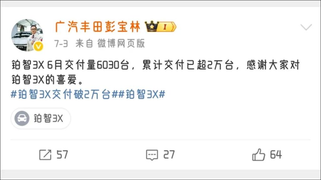 7月3日这天,彭宝林在社交平台上再次透露了,“铂智3X于6月的交付量达到了6030辆,累计交付已超2万辆。”