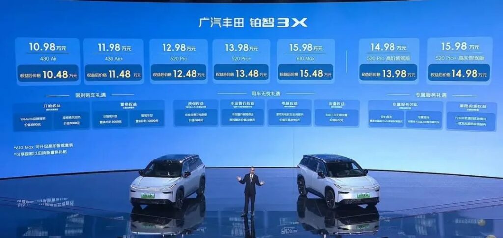 除了精准的卡位,还有一步到位的精准定价。铂智3X共推出7款车型,入门款低至10.98万元,补贴后价格低至10.48万元,10万级就能拥有丰田超严苛安全标准打造的智能纯电车型。智能驾驶辅助版本起售价14.98万,是14万级唯一带激光雷达的全场景智能驾驶辅助车型,补贴后价格更低至13.98万元起。