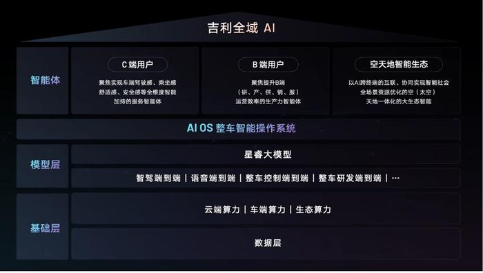 其实过去很多车企说AI,更多仅限于娱乐和座舱系统层面,但吉利的“智能汽车全域 AI”则不太一样,其是基于AI原生OS构建,覆盖了C端消费者、B 端企业服务以及空天地一体的智能生态,相比单纯的车端 AI 应用的范畴,其智能汽车全域 AI 覆盖的范围更广、内容也更丰富,致力打造有温度、有情感、可持续成长的原生“出行智慧生命体“。