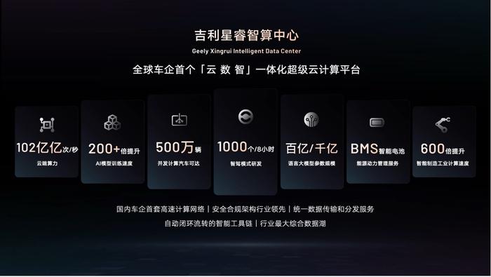 在算力领域,吉利建成了行业首个“云数智一体“超级智算中心——吉利星睿智算中心,并完成了行业首个智能计算中心管理流程的认证。目前,吉利星睿智算中心的云端总算力已迭代到 102 亿亿次/秒,赋予车云一体 BMS 系统 AI 算力支撑和云端实时安全保护,可支持 500万在线车辆的智算需求。