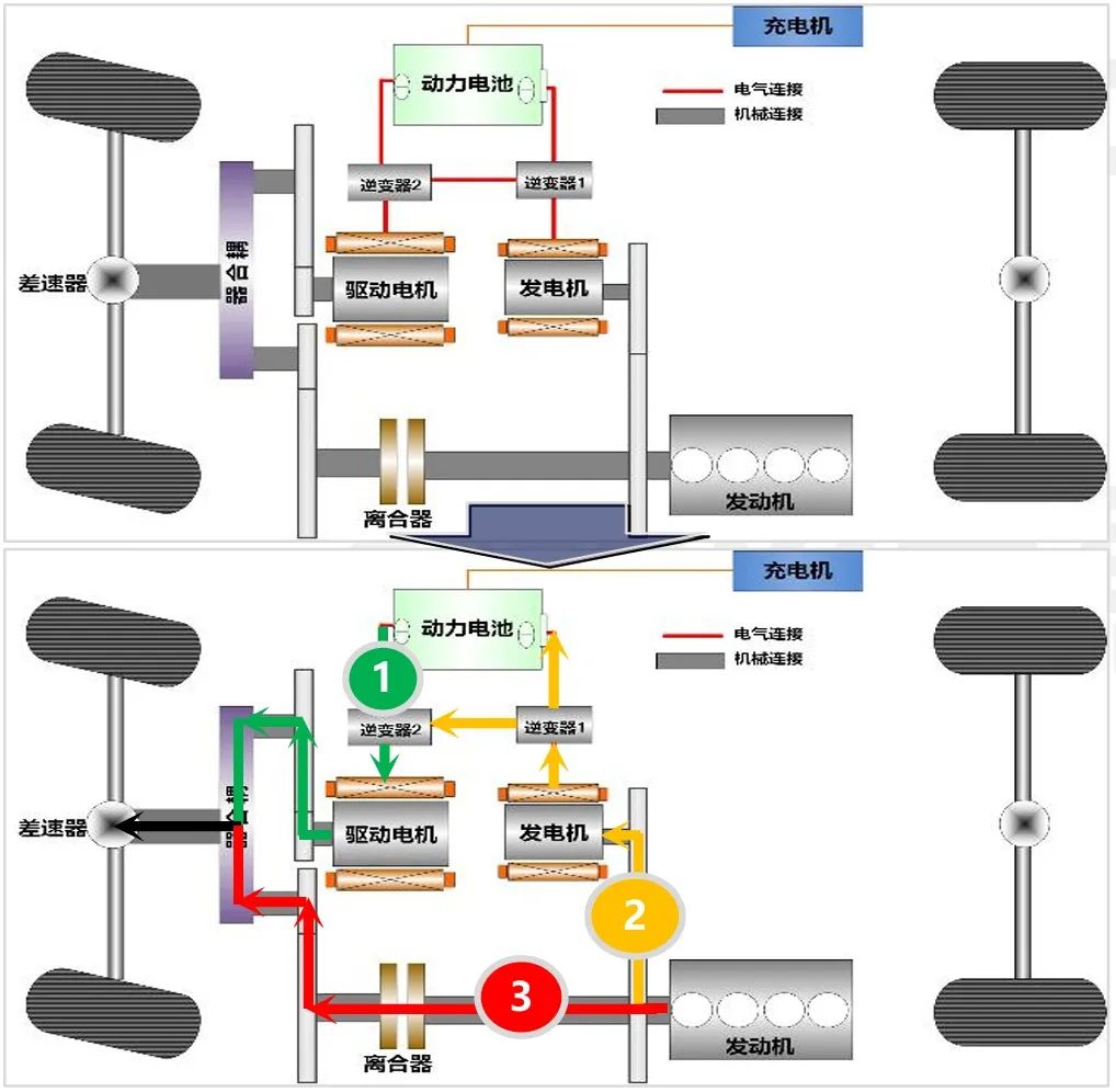 图|红旗超级混动系统动力输出逻辑:①纯电工况②中低速下增程工况③发动机直驱高速工况,中低速下车辆加速采用①②联合模式,高速下超车①③联合