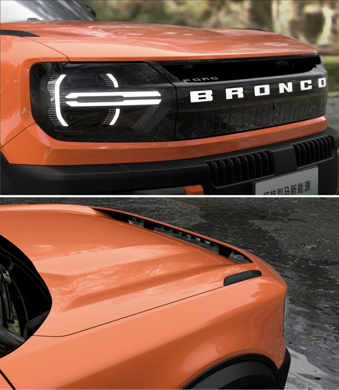 可以看到新车设计继续走方盒子路线,保留了福特烈马挺拔的车身姿态、利落的肩线以及饱满的轮拱设计,于细节之处彰显其传承6代的硬派纯血基因,虽简洁但也充满肌肉感。前格栅上宽大可点亮的BRONCO字标与升级后的数字化大灯相连,形成极具视觉冲击效果的贯穿灯带,也颠覆了当前主流新能源方盒子车不够电感的设计表达。