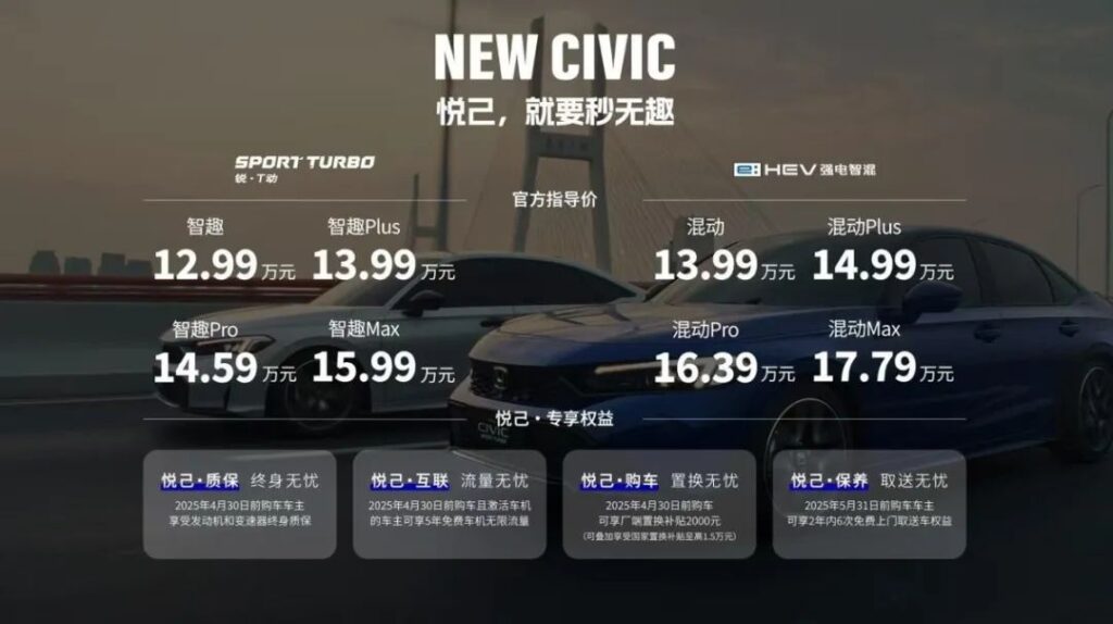 与此同时,在价格战常态化的当下,新车往往通过升配降价让消费者真实感知出诚意。而第十一代新思域燃油版相比旧款起售价虽然没变,但其他配置均降数千元、混动版同配置更是下降1万元,更增加了13.99万元的入门版,进一步增加了混动车型的接受度和性价比。