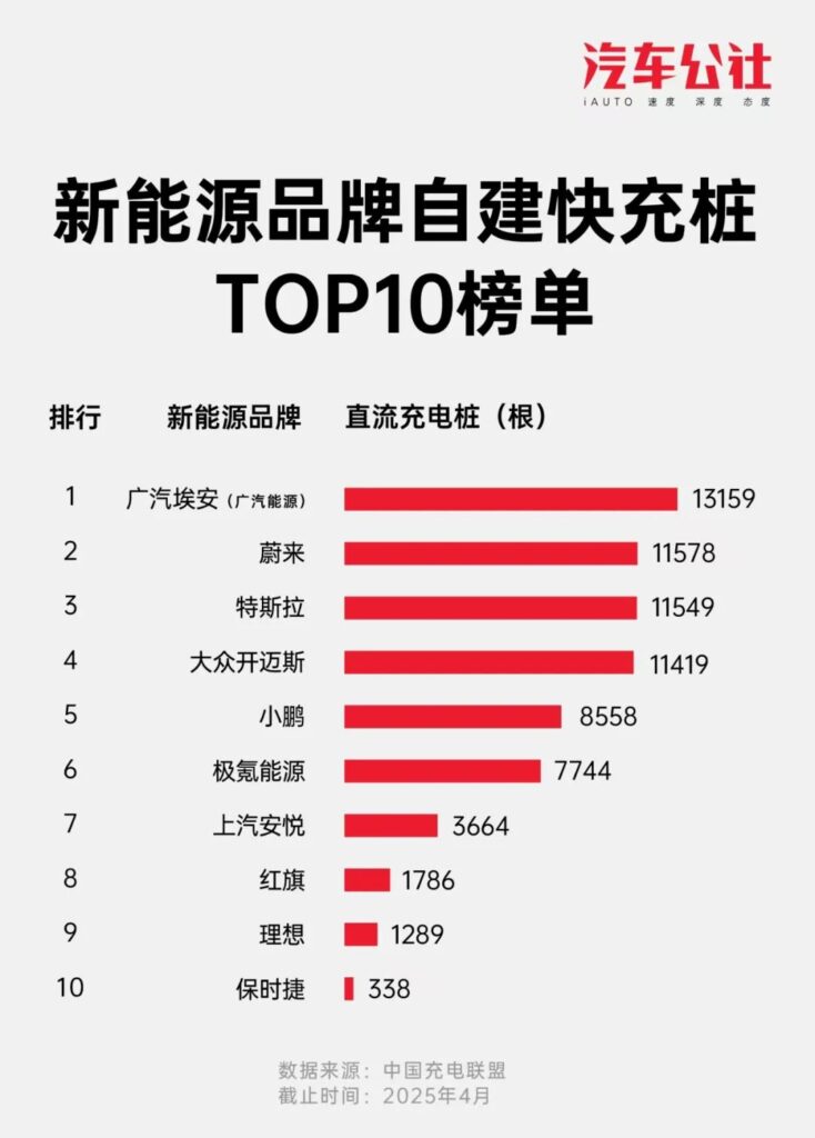 而从这个榜单来看,广汽埃安和蔚来的自建直流充电桩也超过特斯拉,第一梯队效应明显。特别是,从中国充电联盟2025年4月报告中可以看到,广汽埃安以“自建直流快充桩保有量位于车企第一”破局,并将产品战升级为“能源生态战”。