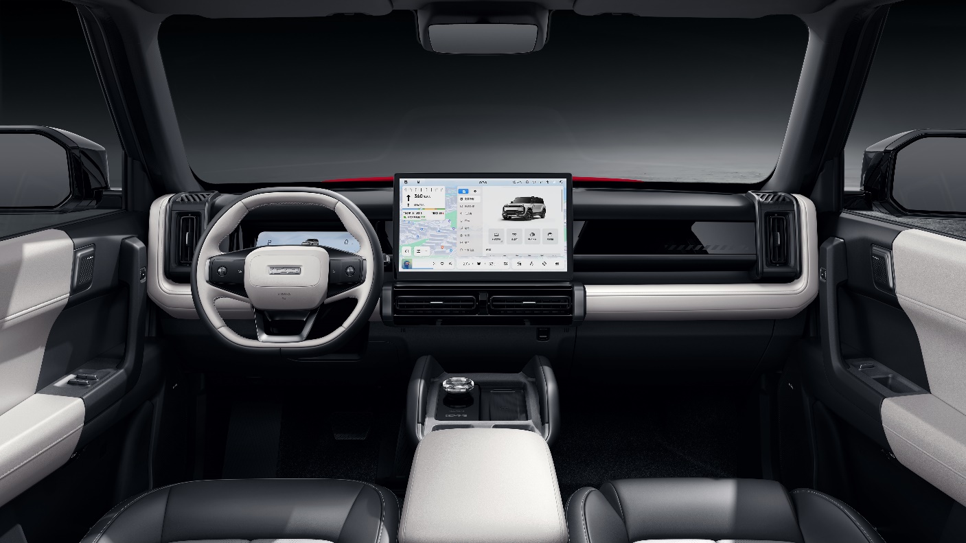 再加上,更为激进的侧包围、贯穿式进气口等机能元素,iCAR 03T打造出极具视觉压迫感的宽体造型,配以19寸轮毂(全系标配),进一步提高车身姿态(离地间隙最大可达 225mm),视野体验堪比硬派越野,实现“更硬派的合法上路”。