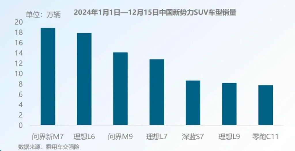 庞大的销量数字背后,是整个市场对于这款车型的高度认可,而这一点从销量排名就可见一斑——纵观2024年1~11月的国内单一车型销量榜单,问界新M7是唯一一款名次进入到20以内的中大型车。这个成绩是如此地惊人,因为榜单的前20名除去B级轿车和中型SUV各一,其余则清一色都是走价廉物美跑量路线的A级/紧凑级别入门车型。