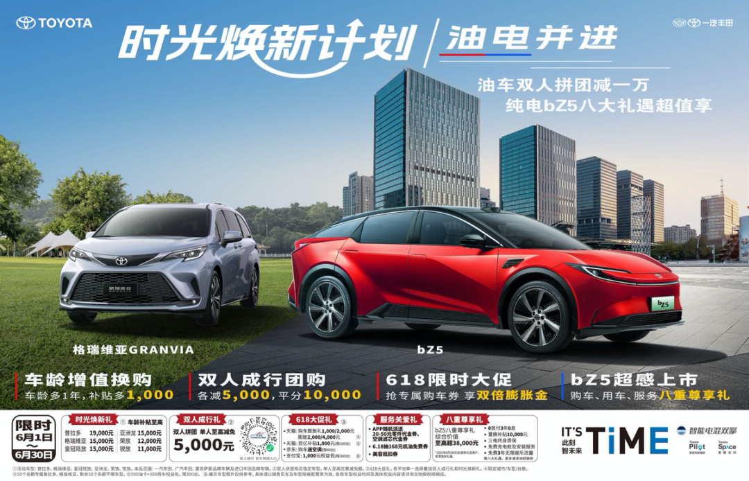 例如今年3月启动的“时光焕新计划”,开创了行业内“车龄增值”概念的先河,为自身品牌的老车主们提供车龄每增加一年,换购补贴递增1000元的优惠。而叠加的“双人拼团减免”活动则,更激活新客流量——RAV4荣放等车型拼团立减5000元。