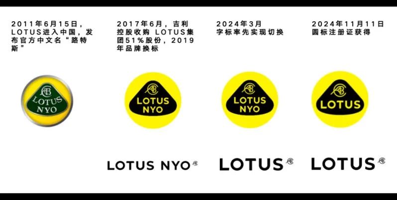 2024年3月,LOTUS 字标正式取消了NYO后缀;同年11月11日,LOTUS 新的圆标获批,LOGO中正式取消了NYO后缀。至此,LOTUS在中国迎来了全新的品牌形象。从莲花工程、到车队、到中文商标,真正完成了莲花的品牌版图,实现了吉利的超跑梦。