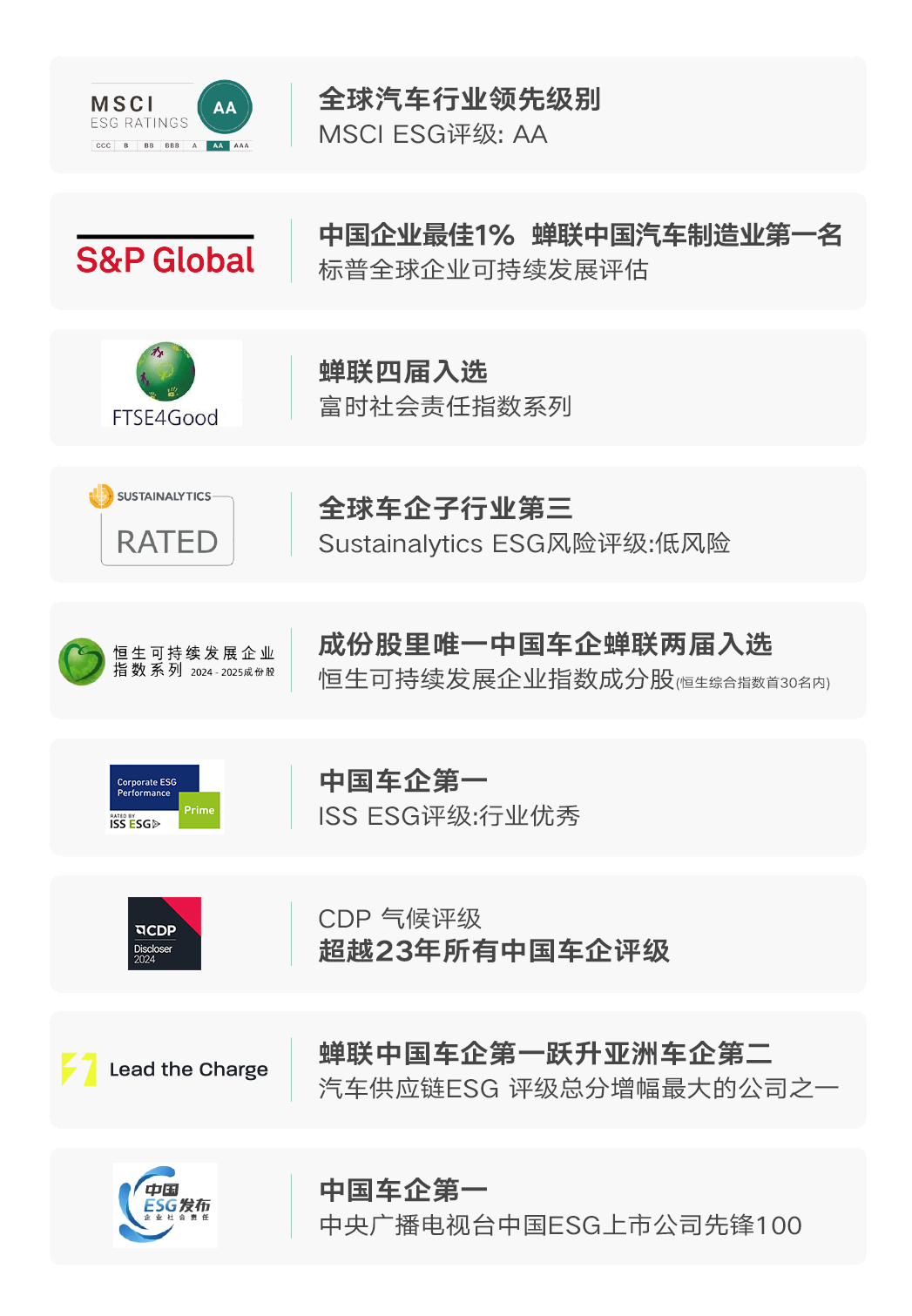 凭借ESG管理工作的推进落地、全面详尽的ESG信息和战略披露、和利益相关方的充分交流探讨,吉利汽车2024年ESG相关工作赢得外界的广泛赞誉和权威认可,包括连续三年荣获《财经》双碳领导力“卓越”评级,连续两年位居“中国ESG上市公司先锋100”榜单第八、蝉联中国车企第一名,还获得国际最具权威性的MSCI ESG评级AA级,且连续两年入选恒生可持续发展企业指数,ISS ESG评级行业优秀、中国车企第一等荣誉,充分印证了吉利汽车的中国车企ESG标杆地位。