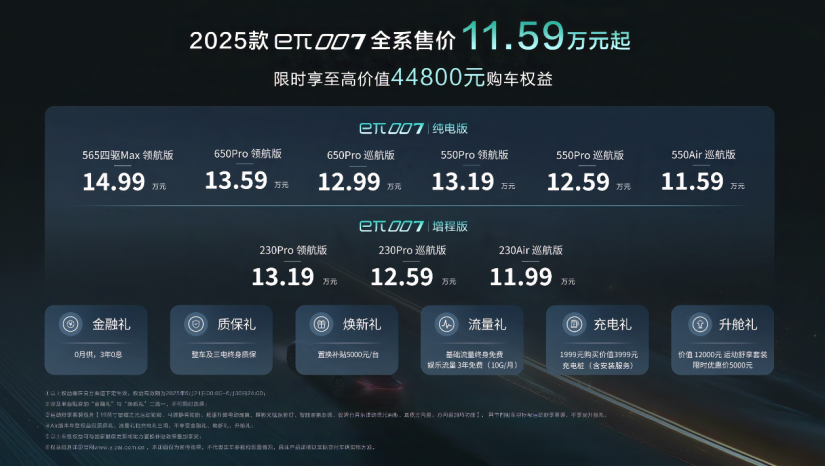 凭借惊艳的外观与诚意满满的价格配置,eπ007一直是年轻人买得起、开得爽的主流选择,如今2025款车型带来了进阶的全新体验。新车集优雅与个性于一身,外观内饰设计让人一见倾心、瞬间来电。新车升级“天际晶格”LED贯穿式尾灯、19英寸星耀之光运动轮辋,颜值再升级。车内采用全新的云感亲肌皮质座椅,乘坐区域增添高弹海绵,并新增靠背通风,长途驾驶久坐不累;此外,车内还新增自带加热功能的真皮方向盘、四门电释放开门按键等舒享配置,为用户带来更具质感的贴心体验。