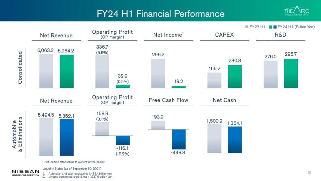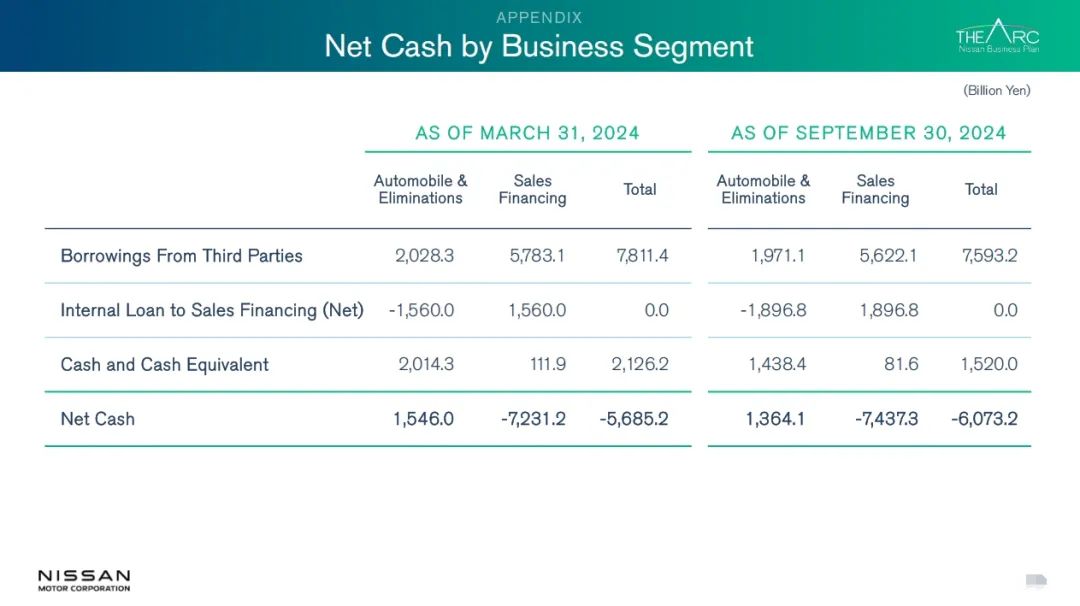日产汽车业务中的净现金保持在1.3万亿日元的稳健水平。此外,公司的流动性状况同样良好,拥有1.9万亿日元的未使用承诺额度以及1.4万亿日元的现金等价物。