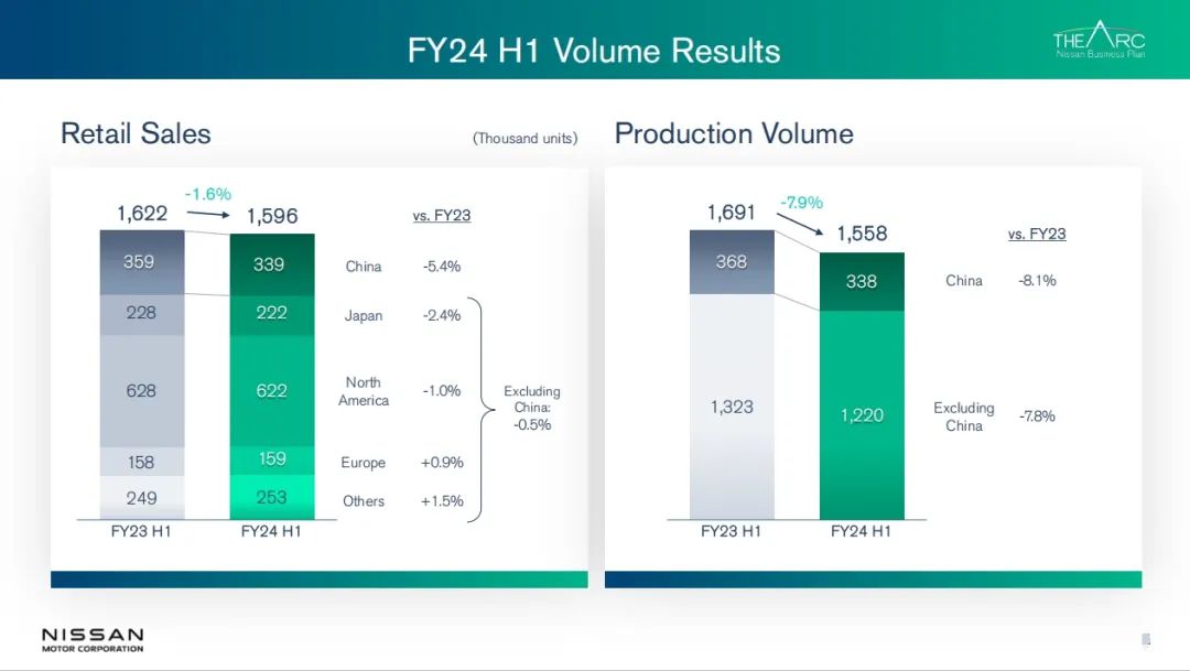 首先,全球销量的下滑,主要是由于主要国家的销售放缓所导致的。特别是在全球两大新车市场——中国和美国,情况尤为明显。在2024年4月至9月期间,中国汽车销量经历了最大达14.3%的跌幅,而美国市场也下滑了2.7%,日本本土的销量就下降了2.4%。这导致日产同期全球销量同比下降了3.8%。