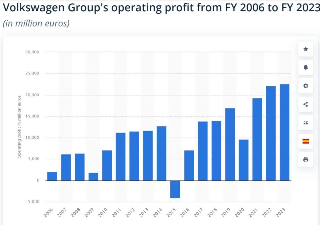 体量足以和丰田分庭抗礼的大众,在2009年、2015年、2020年都出现过利润暴跌甚至亏损。
