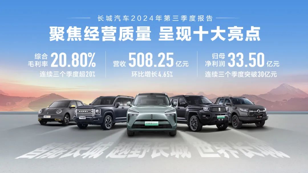 数据显示,2024年第三季度,长城汽车营收508.25亿元,同比增长2.61%;综合毛利率20.80%,连续三个季度稳定在20%以上;归属于母公司股东的净利润33.50亿元,连续三个季度单季度归母净利润突破30亿元。