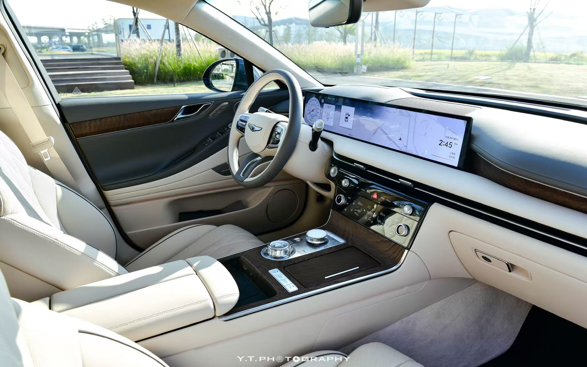 打开车门,捷尼赛思G80的内饰设计令人眼前一亮。车内采用了大量的皮质包裹和实木饰板,质感出众,营造出一种高档的氛围。27英寸的仪表和中控双联屏设计,显示效果清晰细腻,科技感十足。中控台下方保留了一些实体按键,方便驾驶员在行驶中进行盲操。三辐式双色方向盘设计精美,手感极佳。