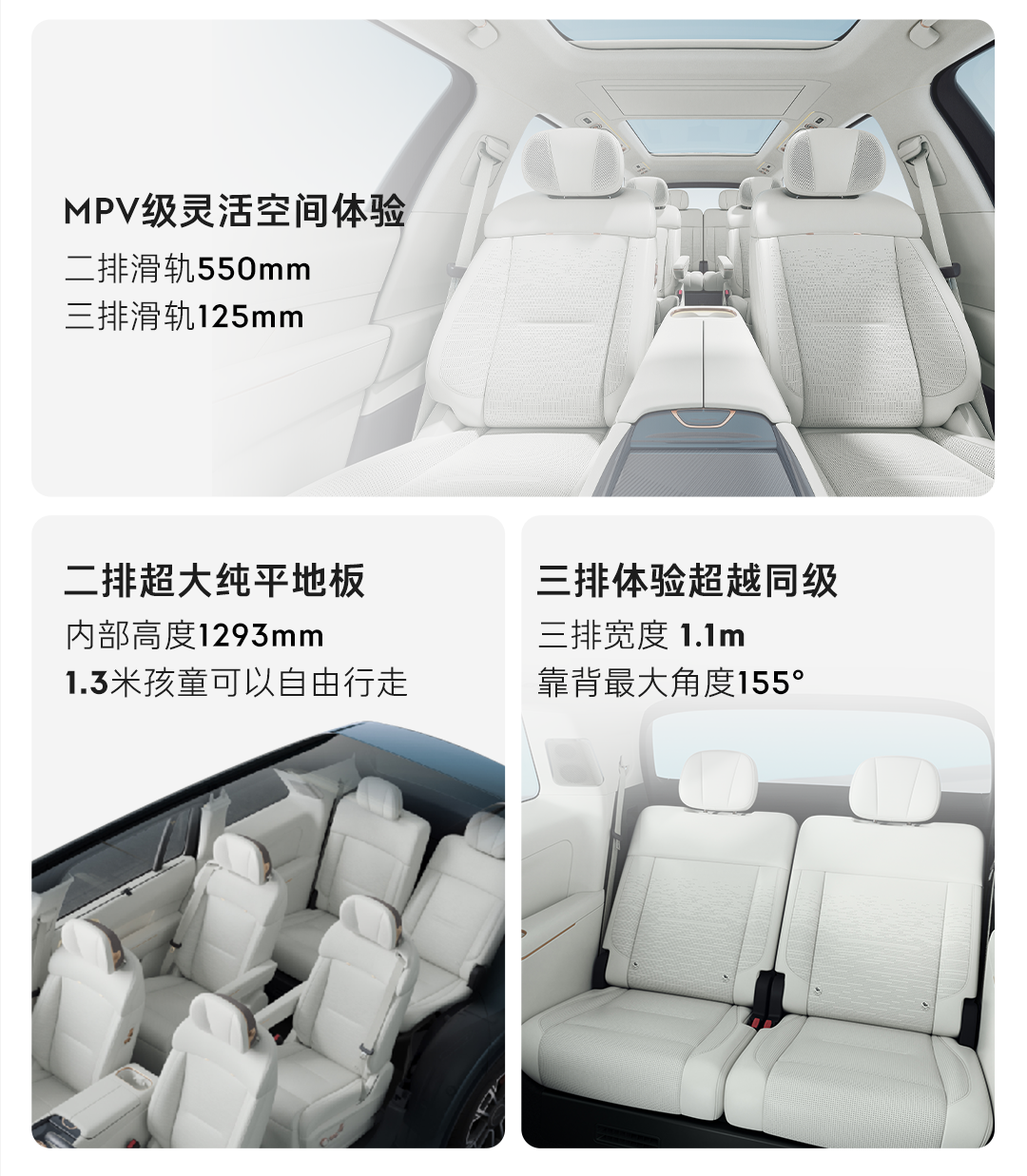 这一次SPA Evo架构就专注打造轴距3m、车长5m起步的豪华大车,结合大电池、座舱纯平地板等专属开发设计,因此可以做到88.2%的同级最高X向、76.2%的同级最高Y向空间利用率,二、三排都带座椅滑轨,最大155度靠背角度可调,让整车车内空间有同级MPV的产品表现。