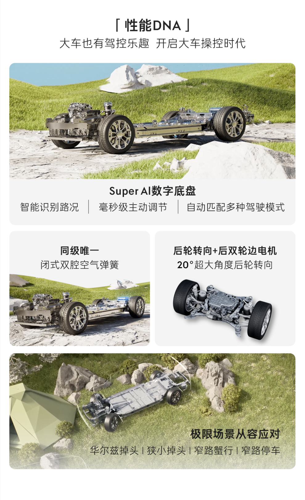 在新能源汽车时代,电机的加持似乎让性能变得廉价,而像电磁悬架、空悬等技术的搭载,感觉车辆的底盘性能也提升了一个等级。但其实性能不仅仅是零百加速,底盘也不仅仅靠配置和堆料。SPA Evo架构下的新车,强悍的依旧是积淀非常深厚的调校能力,再配上同级唯一的闭式双腔空气弹簧,领克Super AI数字底盘,2.0T电混发动机+DHT Pro+2*160kW P4轮边电机,后轮转向等最新技术的上车,底盘能力和操控又提升了上限,让底盘和操控有了性能和智能的双重加持,驾驶也变得更有乐趣。