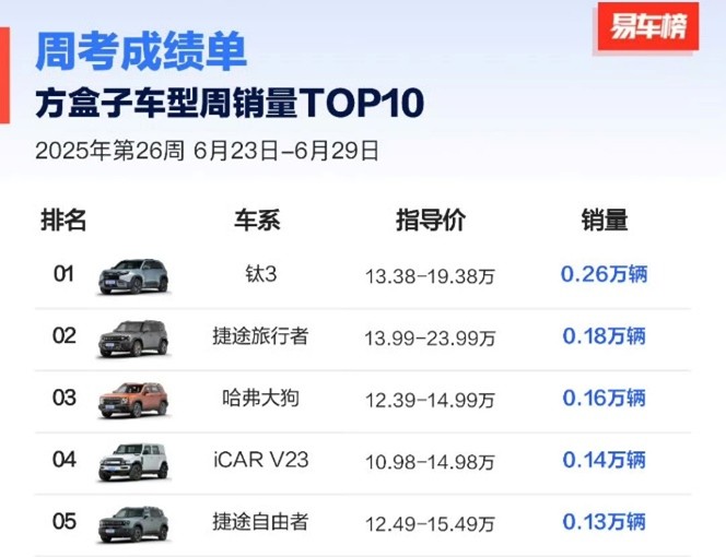 值得一提的是,6月第四周,钛3销量为2,600辆,位列方盒子车型周销量TOP1。