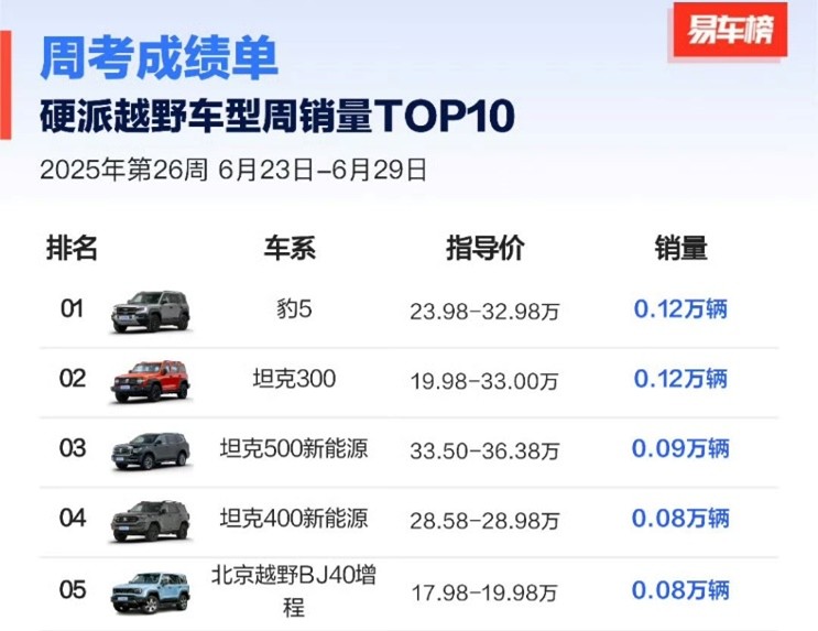 同样,6月第四周,豹5销量为1,200辆,摘得硬派越野车型周销量桂冠。