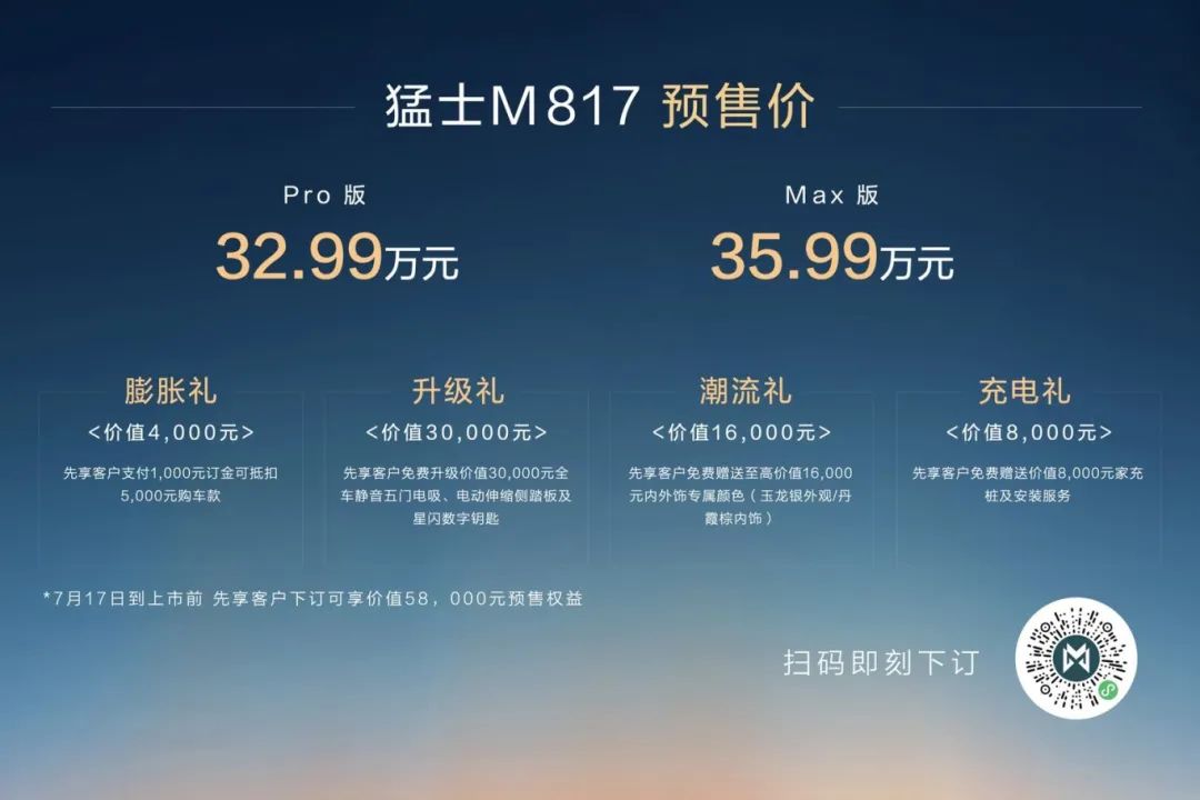 而32.99万元起售的惊喜预售价格与厚载诚意1000元定金抵扣5000元购车款的膨胀金、8000元的充电礼、16000元的潮流礼和价值30000元的升级礼的预售政策,则表明了猛士M817强势叩击豪华智能越野市场的决心:这不仅是对传统定价体系的革新,更是猛士以普惠姿态践行“豪华平权”的硬核宣言。