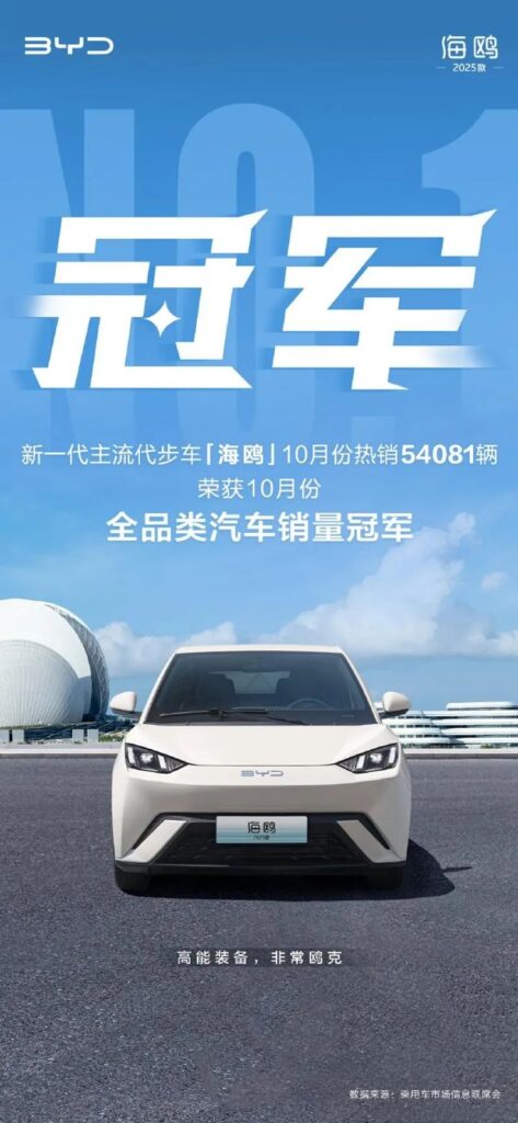 就像在过去的10月,比亚迪海鸥成为全行业单月销量最大的车型,达到54081辆,以一己之力改变了一个细分市场的结构,将代步车消费从功能单一的1.0时代带入了重品质、重体验的精品化时代,让中国消费者感受了A00级小车品质,也让友商明白了“原来代步车还可以这么造”。